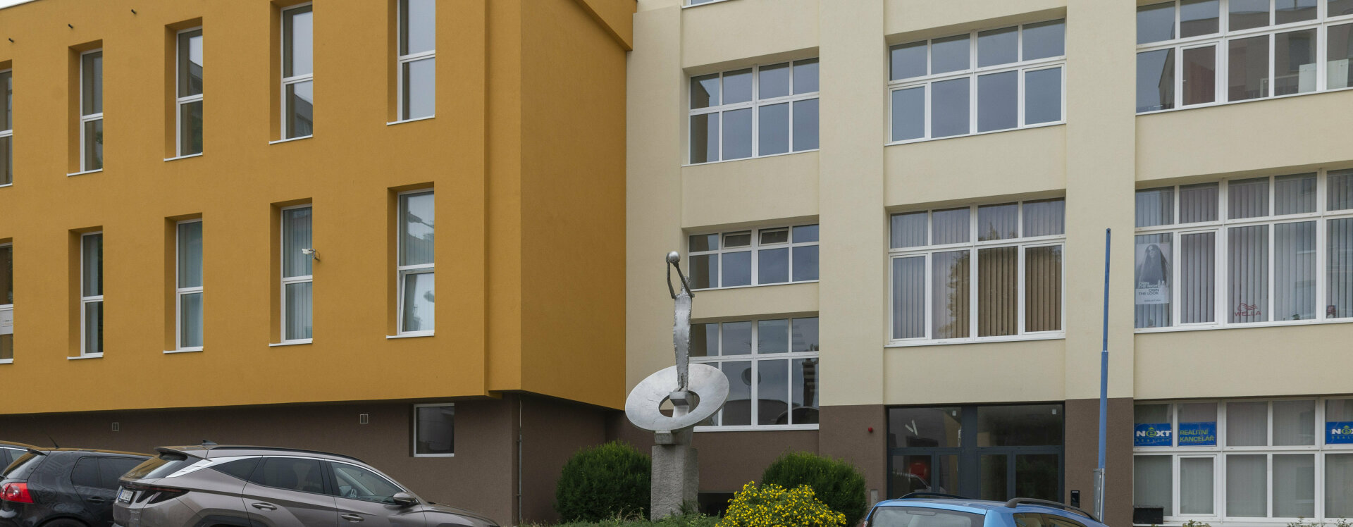 Z kovu byla vytvořena i plastika pro Brod. Schematizovaná silueta člověka z kovového pásu, na hranách jakoby hněteného prsty, zvedá v rukách družici. Postava se změkčenými konturami je umístěna na geometrické konzoli uprostřed precizně vybroušeného ocelového prstence – přijímače signálu. Jako by objekt prostřednictvím odlišné práce s materiálem poukazoval na paradox oboru, v němž se střetávají možnosti lidského myšlení a inteligentní techniky.